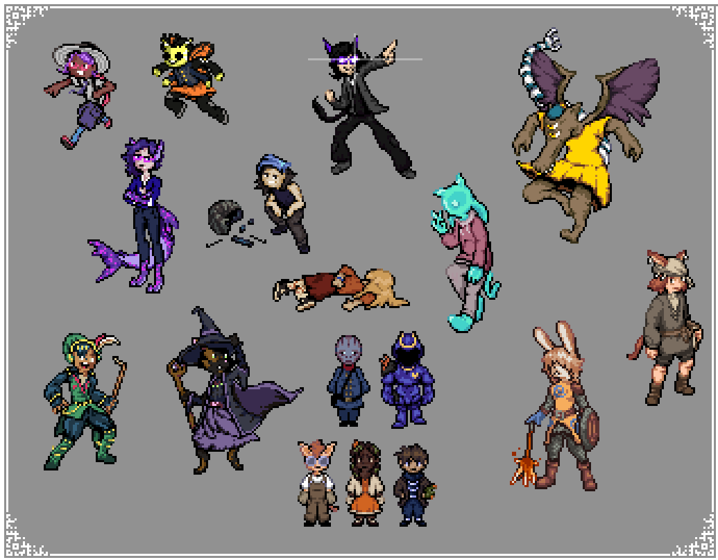 This, meanwhile, is a collage of work I did in the summer of 2024 for an online event called ArtFight, showing multiple characters designed by other people. This is the size I more commonly work with! |